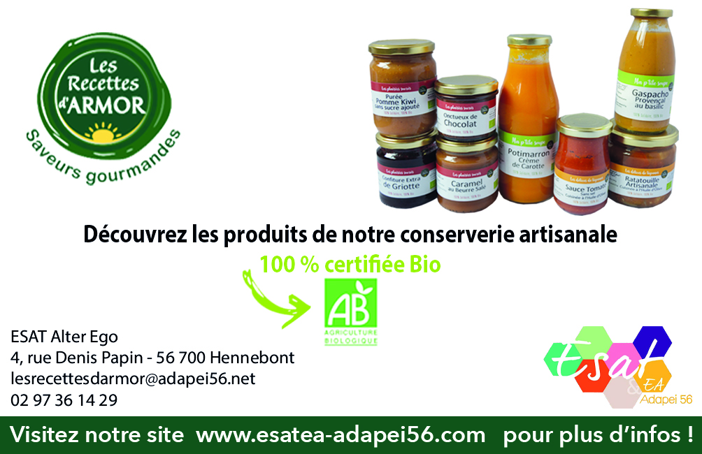 A la conserverie de l’ESAT Alter Ego à Hennebont, l’équipe s’active pour produire soupes, légumes cuisinés, sauce tomate, compotes, confitures... L’atelier fabrique sous sa propre marque « Les Recettes d’Armor » (commercialisée en boutiques bio), mais propose aussi du façonnage.
